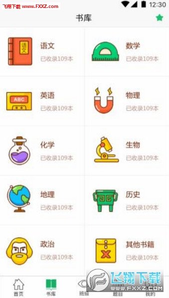 书库包括语文、数学、英语、物理、化学、生物等选项