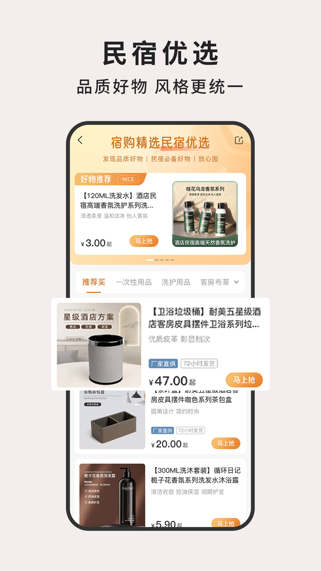宿购平台是一款专为用户提供便捷购物体验的移动应用,旨在通过高效的用户界面和多样化的产品选择,让购物变得更加轻松愉快。无论是日常用品还是时尚潮流,用户都可以在平台上找到心仪的商品。通过简单的操作,您就能轻松完成购物,享受高质量的服务与实惠的价格。