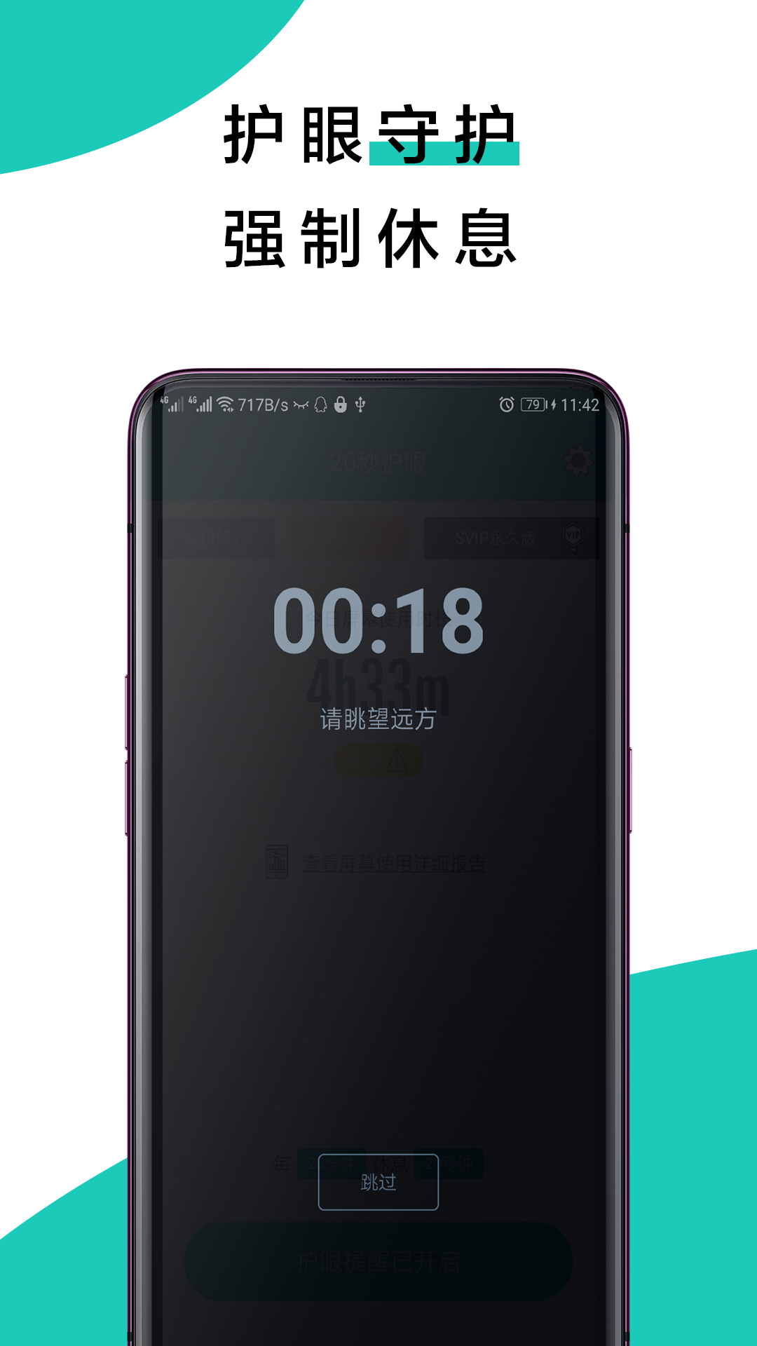 4. 智能锁屏提醒:当用户长时间未停下屏幕操作时,自动弹出护眼提示并锁屏休息。