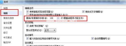 4.输入选项后,单击工具栏中的编辑,然后找到撤消/恢复操作步骤。我们可以修改步骤,并在修复完成后单击确定。需要注意的是,WPS程序需要重启才能生效。