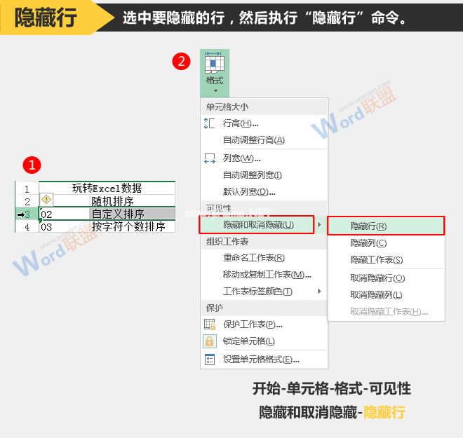 1.拖动鼠标选择要隐藏的行的行号(一行或多行),切换到“开始”选项卡的“单元格”组,然后从“格式”下拉菜单中选择“隐藏行”和“取消隐藏”。