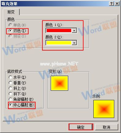 3.点击“填充效果”对话框中的“双色”按钮;然后从下一个“颜色一”和“颜色二”中选择两种不同的颜色。在边肖将颜色1设置为红色,将颜色2设置为黄色,然后单击中央辐射按钮。一切就绪后,点击“确定”按钮;