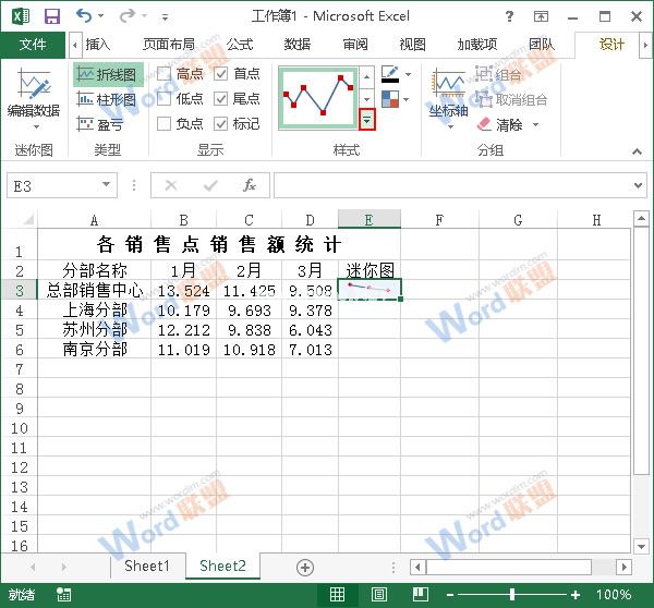 8.回到工作表,现在让我们修改折线图的样式,单击“样式”组中的“其他”按钮,然后从弹出菜单中选择所需的折线图样式。这里,我们选择“迷你图表风格着色1,(无深色或浅色)”。