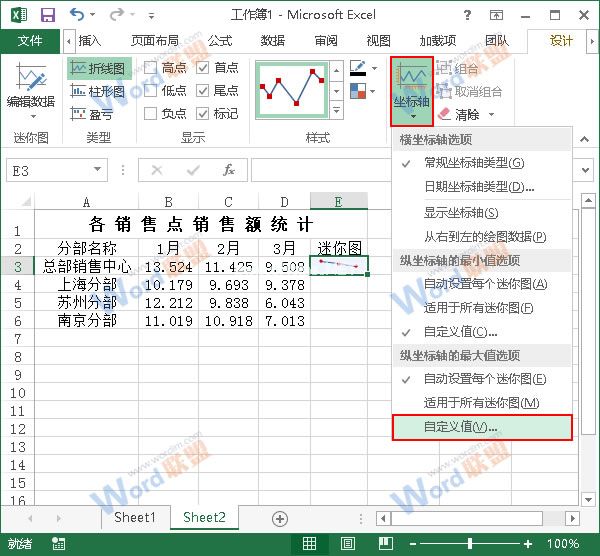 4.现在,让我们修改小图表的坐标轴格式,并在“坐标轴”组的“垂直轴的最小值选项”区域中单击“自定义值”选项。