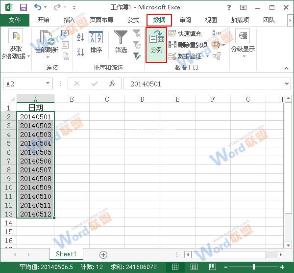 1.打开Excel2013中包含数值的工作表,注意数值必须为8位,其中前4位代表年份,中间2位代表月份,最后2位代表日期。然后选择要转换数值的单元格,切换到“数据”选项卡,点击“数据工具”组中的“列”按钮。