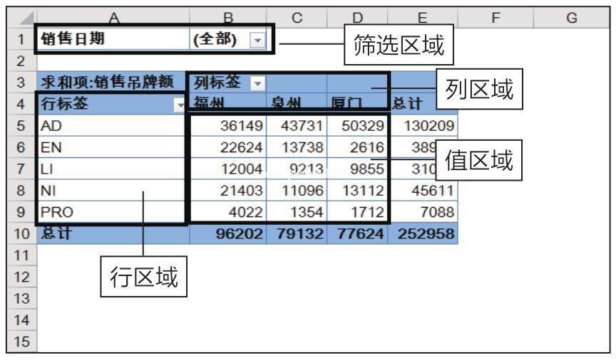 学习透视表,首先要了解透视表的结构。在结构上,透视表分为四个部分。