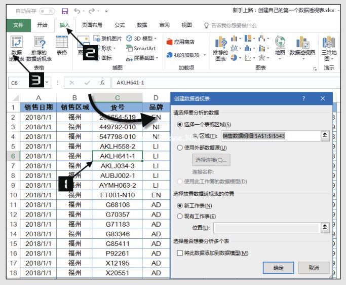 第一步:在下图所示的销售明细日账中选择任意单元格(如C6),点击【插入】页签中的【透视表】,弹出【创建透视表】对话框。