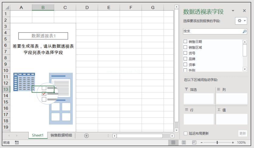 第四步:在[透视表字段]窗格中选择“销售区域”字段,按住鼠标左键并将其拖动到[列]区域。“销售区域”字段将在数据透视表中显示为一列,完成的数据透视表如图所示。