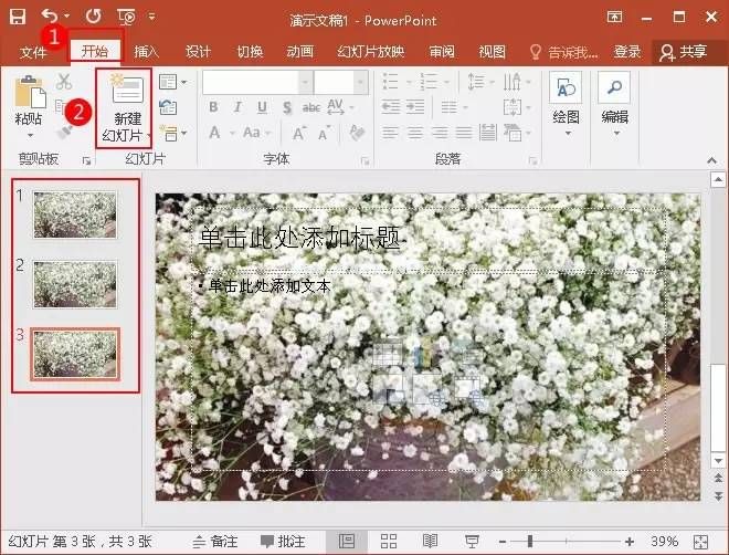 5.切换到“开始”选项卡上的“幻灯片”选项组,单击“新建幻灯片”,使所有幻灯片的背景图片都相同。
