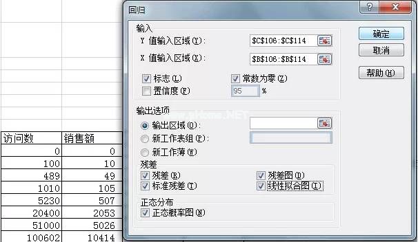 2)选择【X值输入区】的访问号单元格、【Y值输入区】的销售金额单元格,勾选以下选项,包括残差、标准残差、残差图、线性拟合图、正态概率图。