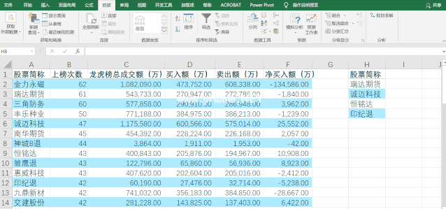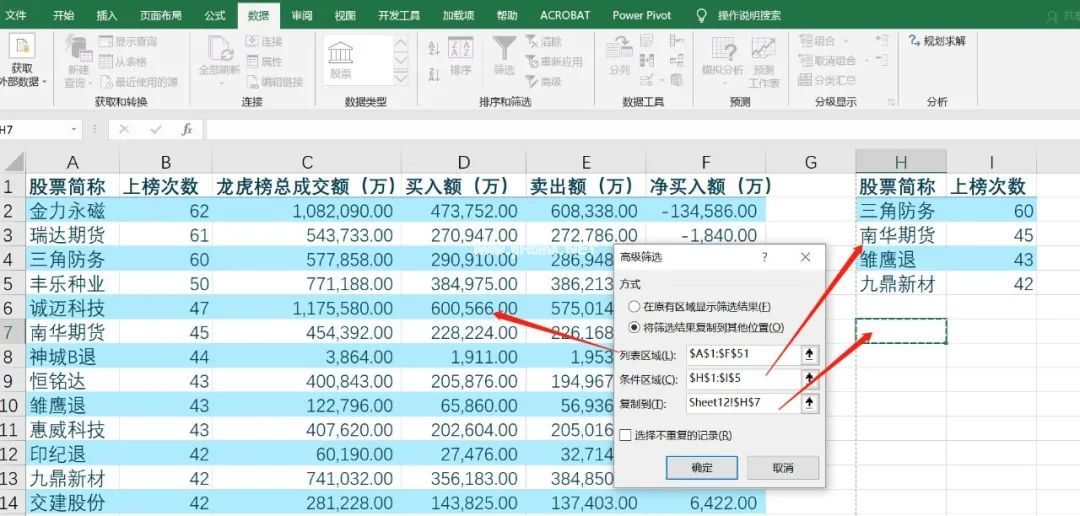 点击【数据】-【高级】,在弹出的对话框中选择【将过滤结果复制到其他位置】,在【列表区域】中选择区域A1:F54,在【复制到】中选择H1单元格,勾选【选择不重复记录】,最后点击【确定】。