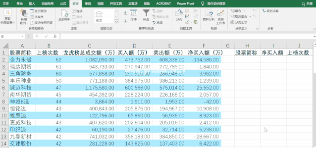 点击【数据】-【高级】,在弹出的对话框中选择【将过滤结果复制到其他位置】,在【列表区域】中选择区域A1:F51,在【条件区域】中选择区域h13360j1,在【复制到】中选择单元格H1:J1,最后点击【确定】。