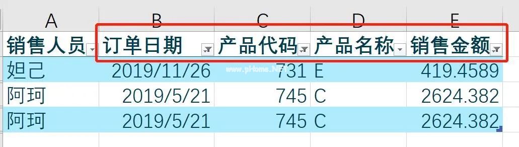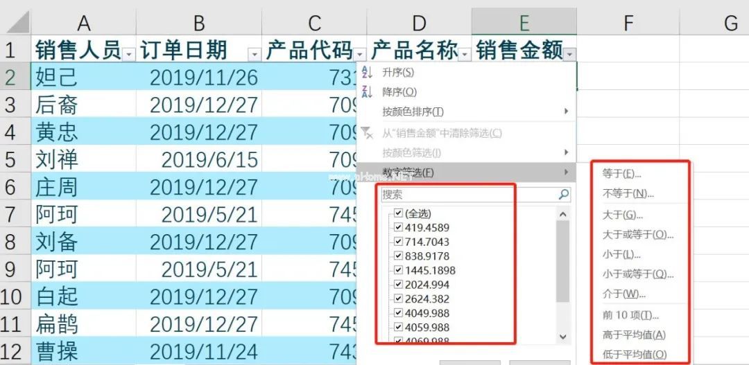 除了常见的文本、日期和数字过滤器,您还可以按颜色进行过滤。当我们查看几条数据时,我们经常需要对异常数据进行颜色标记。例如,您需要过滤以蓝色标记的异常销售记录。
