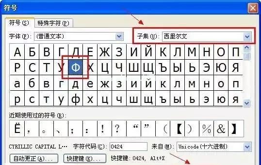 当子集被剪切为西里尔文时,您将看到符号,并在选择后插入它。