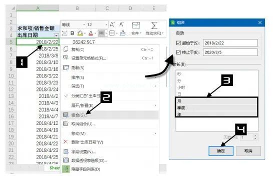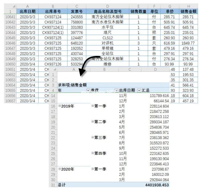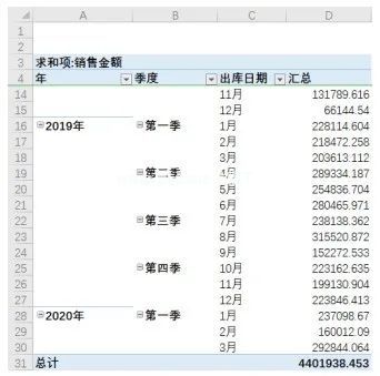 在图中所示的透视表中,通过按年、月、季度快速汇总“出库日期”字段,用户可以快速查看不同时间维度的销售金额汇总。利用透视表的【组合】功能快速实现。操作步骤如下。