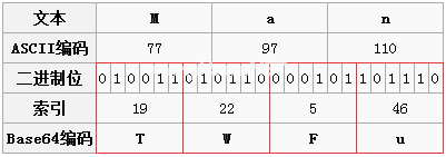 那么如何用6个有效位来表示8位繁体字呢?8和6的最小公倍数是24,也就是说3个传统字节可以用4个Base64字符表示,这样有效位数相同,弥补了Base64只有6个有效位的不足,多了1/3字节。也可以说两个Base64字符也可以代表一个传统字符,但采用最少公倍数的方案其实是最不浪费的。结合下图更容易理解。人是三个字符,总共24个有效位,所以我们要用4个Base64字符组成24个有效位。红色方框表示对应的Base64,六个有效位转换为对应的索引值,然后对应Base64字符表。发现“Man”对应的Base64字符为“TWFU”。说到这里,有一个原理我不知道你有没有发现。转换为Base64的最小单位是三个字节。对于字符串,它总是三个字节和三个字节,对应于四个字节的Base64。当这一点很清楚的时候,几乎是一样的。