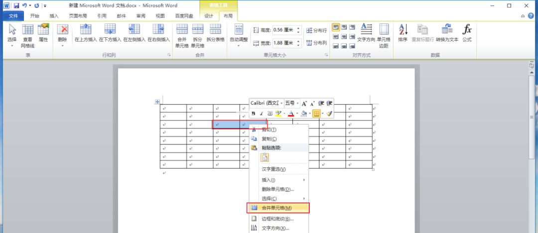 第一步:首先选择要合并的单元格,切换到“表格工具-布局”选项卡,单击“合并”组中的“合并单元格”命令。