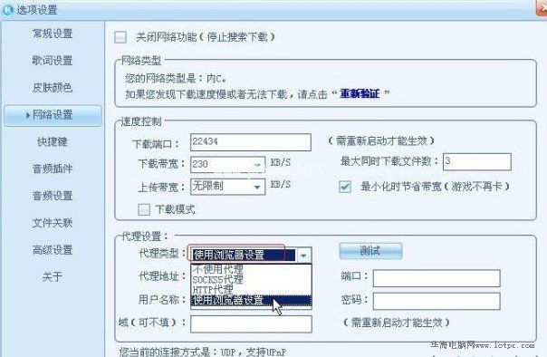 在酷狗网络设置-代理设置-选择使用浏览器设置,然后确认。