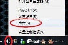 在win7电脑桌面右下角的声音图标上,右键弹出菜单,选择“声音”。