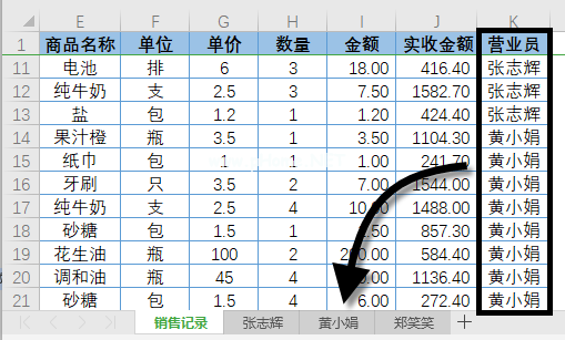 拆分后,以不同销售人员命名的三个新工作表将自动添加到工作簿中,销售人员的所有交易信息都将记录在每个工作表中。