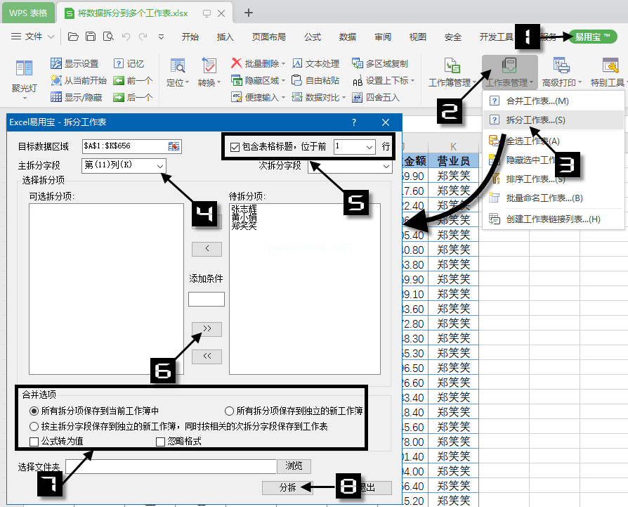 第一步:打开需要拆分的工作表,依次点击易宝工作表管理拆分工作表,在弹出的Excel易宝-拆分工作表对话框中保留目标数据区默认选项。