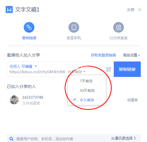 另外,文档共享后的有效期也可以自己设置;时间为7天有效,30天有效,永久有效。