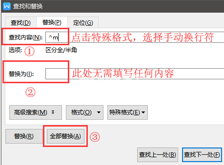 如果不填写“替换”项,点击“全部替换”,所有用回车创建的空白页将被删除。