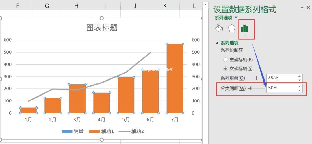第四步:再次设置辅助1系列,双击图表上的柱形图,调出设置的数据系列格式,从系列选项中选择:辅助1系列。