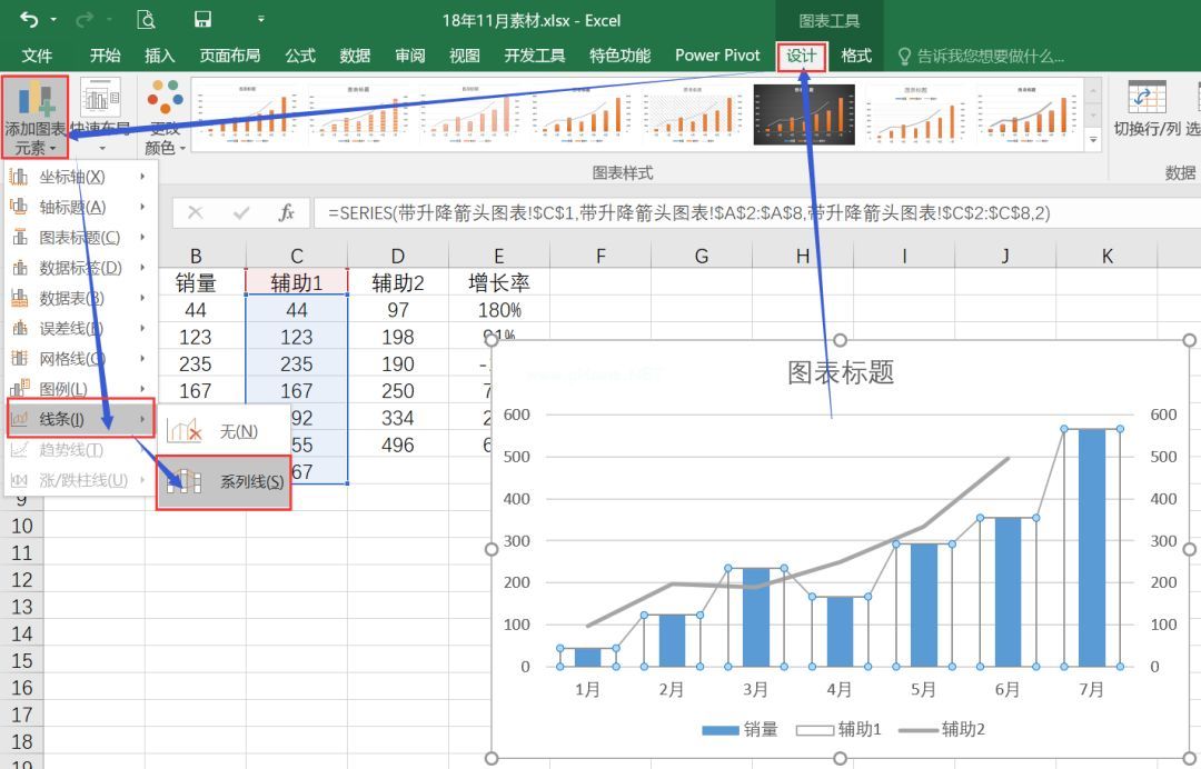 在图表设计工具中,单击添加图表元素,选择线和系列线。