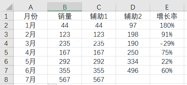 1:首先将原始数据转换为1-7月格式的文本数据,然后插入辅助1,设置为等于b列的数据,然后插入辅助2,其中公式为=B2*1/3 B3*2/3,公式为E2中=(B3-B2)/B2,然后单元格格式设置为百分比形式。