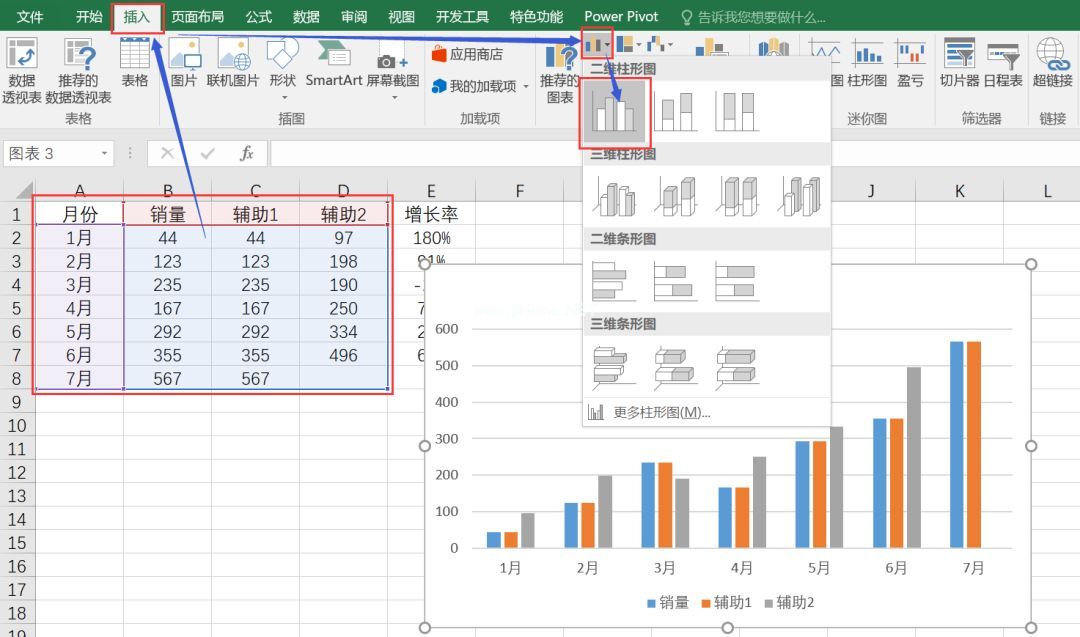 第二步:之后选择A1: D8区域的数据(注意不要选择E列),然后点击选项卡的插入,选择一个聚类柱形图,如下图:
