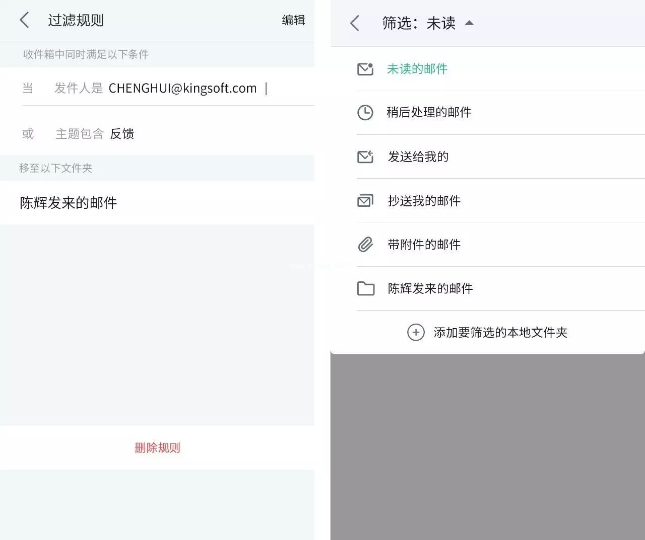 用户使用起来也很方便,只需在设置中添加“过滤规则”,符合规则的邮件会自动移动到文件夹中;同时,它还支持用户在筛选中快速查看,轻松“瘦身”收件箱,从而保持用户收件箱的纯净度,提高查看邮件的效率。