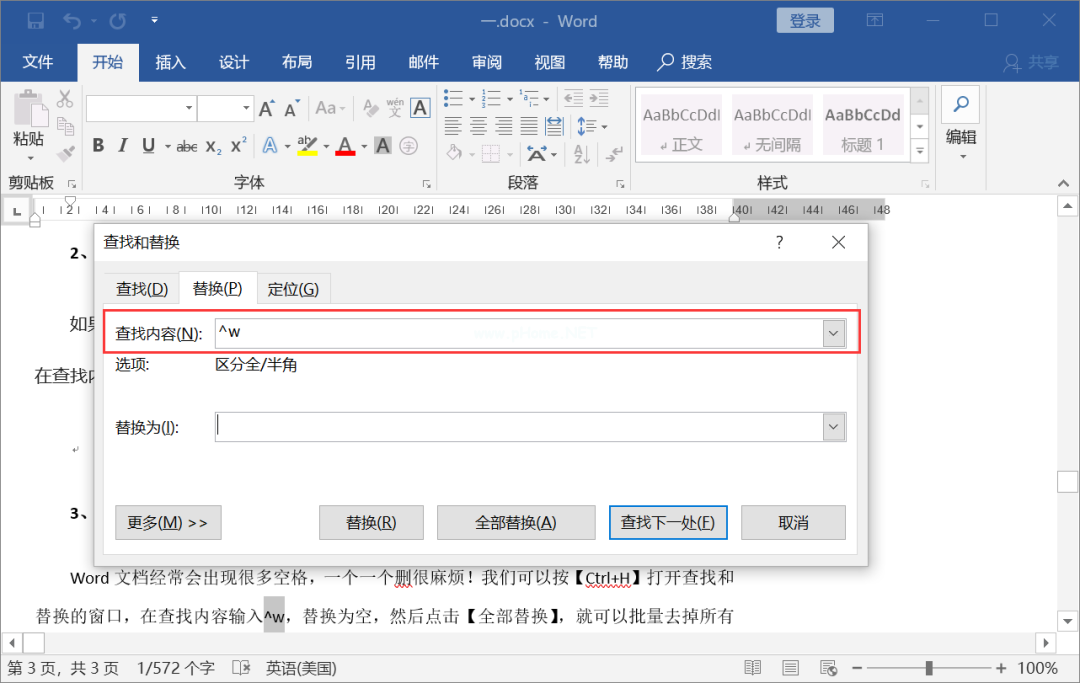 Wps文档往往有很多空格,一个个删除很麻烦!我们可以按[Ctrl H]打开搜索替换窗口,在搜索内容中输入w,替换为空白,然后点击[全部替换],所有的空白都可以批量删除~
