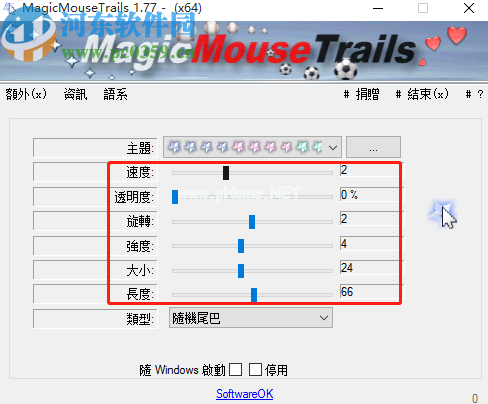 2.设置好鼠标拖尾的主题后,我们可以设置速度、透明度、大小等其他参数。其余选项中,可根据个人需求进行设置。