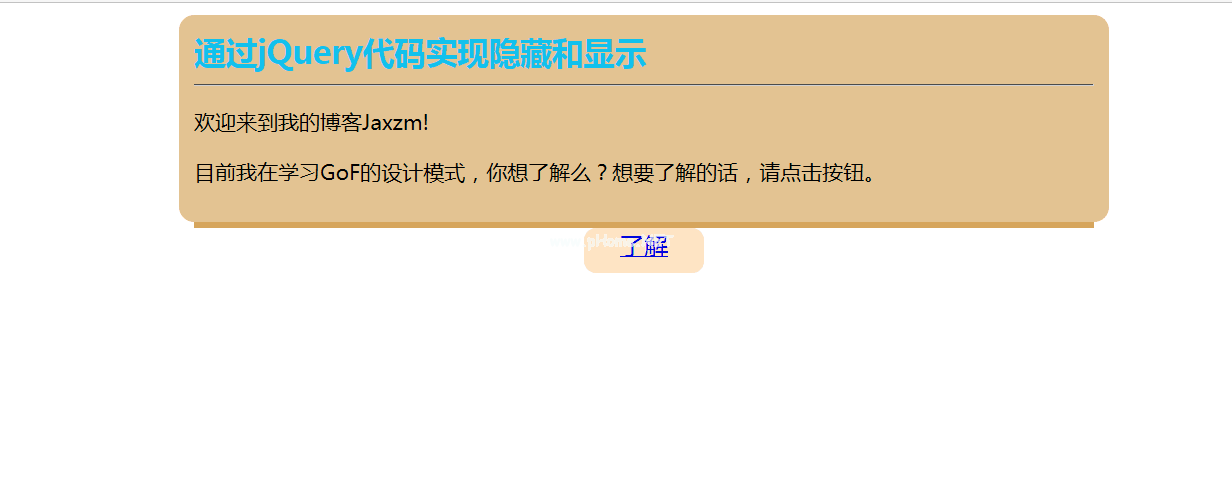 !doctype html heartheta charset=' utf-8 ' title,通过jQuery/title script src=' http:http://libs.baidu.com/jquery/1.10.2/jquery.min.js'类型=' text/JavaScript '/script style type=' text/CSS '进行扩展和收缩。车身{ margin: 0 auto} # show { width: 600pxheight: autofont-size : 14px;背景-color : # E4C 392;display:块;padding: 10pxmargin: 0 autoborder-radius : 10px;} # show h2 { color: # 11C2EEmargin: 0 auto}.滑动{ margin: 0 autopadd : 0;宽度: 600 px;边框-top:实心4px # D6A55C}.BTN-slide { background-color : bisque;宽度: 80px;高度:30 px;文本对齐:中心;margin: 0 autoborder-radius : 8px;margin: 0 autodisplay:块;}/style script type=' text/JavaScript ' $(文档)。ready(function () {$(')。BTN-slide’)。单击(function () {$('#btnshow ')。slide Toggle();});});/script/head dydiv id=' show ' H2 hide并通过jQuery代码显示/h2hr /p欢迎来到我的博客Jaxzm!/pp目前正在学习GoF的设计模式。你想知道吗?如果你想知道,请点击按钮。/pdiv id=' BTN show ' style=' display : none;pGoF描述的23种设计模式可以分为三种:创造模式、行为模式和结构模式。/pp我觉得创建一个模式很难,因为它比较抽象,所以不容易理解,然后我的编码比较少,所以不容易理解这个。/p/div/divp class=' slide ' a href=' JavaScript : div show();'Id='btnhref' class='btn-slide '了解/a/p/body/html这段代码与第一段代码唯一的区别是这段js代码:
