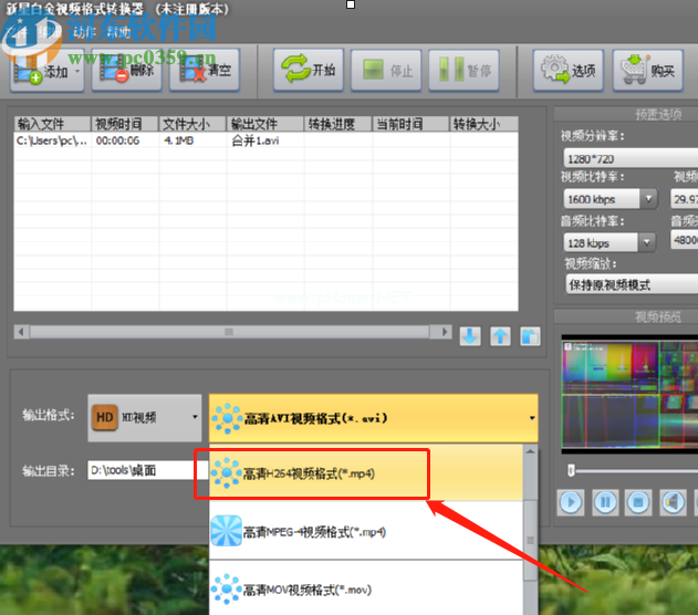 3.将需要转换的视频文件添加到软件界面后,下一步就是在界面的输出格式中选择高清视频。选择后,在下拉列表中找到高清MP4视频格式,点击选择。
