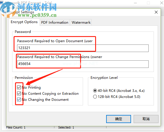 4.点击打开设置界面后,打开PDF文件时可以使用设置界面第一个输入框中输入的密码进行验证,第二个输入框中的密码控制PDF文件的编辑权限。设置密码后,勾选箭头指向的三个选项,然后在打印、修改、复制PDF文件时验证密码。
