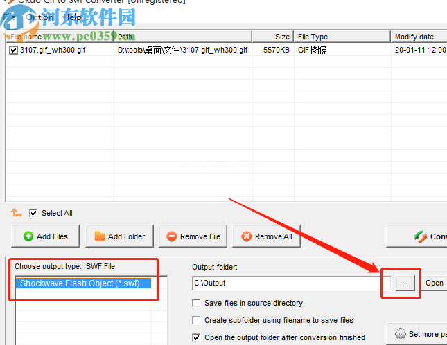 3.待转换文件成功添加到软件界面后,我们可以在选择转换类型的模块中看到待转换SWF类型文件的选项,然后点击输出目录旁边的三个图标。