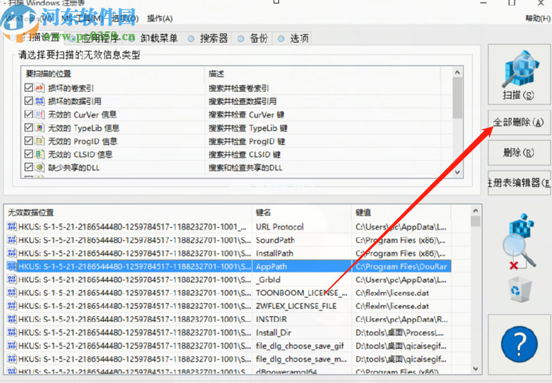 5.最后,我们可以点击选中的目标注册表将其删除,或者点击全部删除功能按钮删除所有注册表信息。