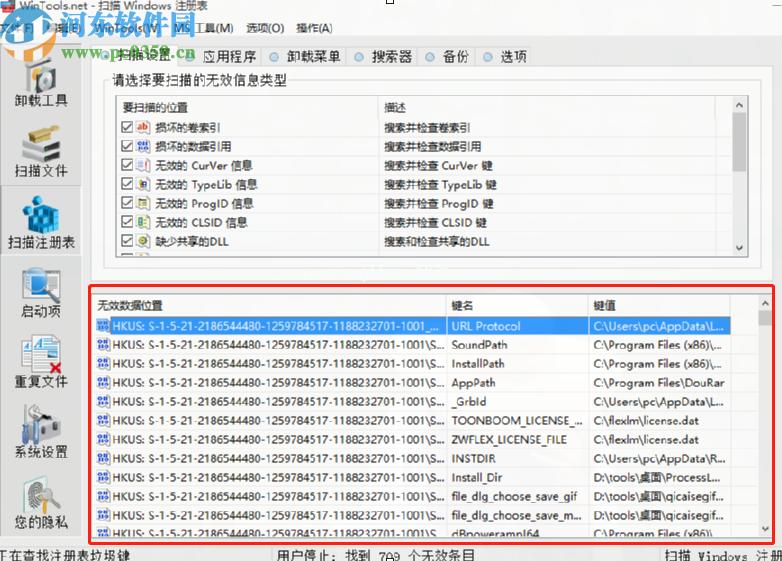 4.扫描操作完成后,我们可以在界面上看到很多扫描的注册表信息,都是无用的注册表。