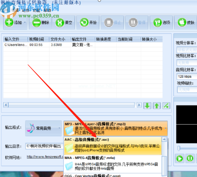3.点击打开按钮后,MP3文件成功添加到软件界面,然后我们可以在下面的输出格式中选择我们想要转换的AAC格式。
