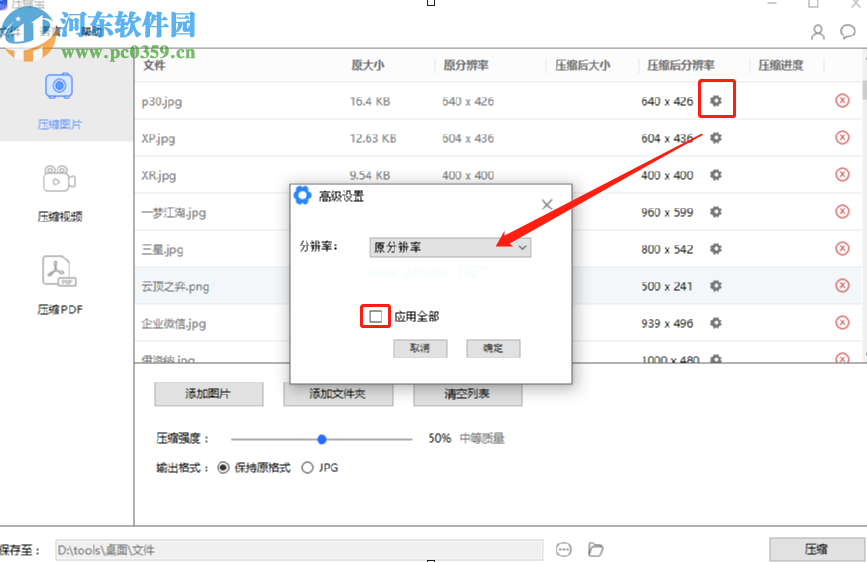 3.点击确定按钮后,软件会自动识别该文件夹中有哪些图片文件。识别完成后,我们在列表选项中点击档位图标,点击这个档位图标,打开图片分辨率设置界面。选择所需分辨率后,您可以检查并将其应用于所有图片。