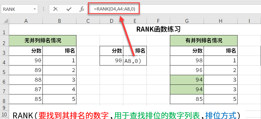 下面是一个计算A4:A8单元格区域中D4单元格得分排名的例子,写如下: