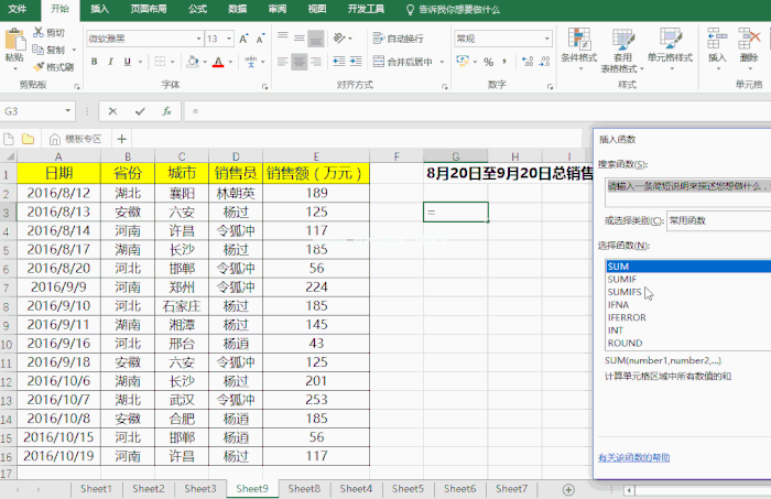 公式:sumifs (e2:e16,a2:a16,“=2016年8月20日”,a2:a16,“=2016年9月20日”)。