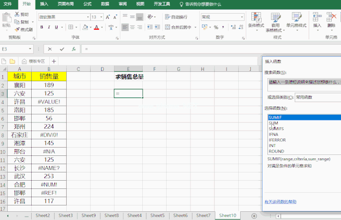 计算全国销量。由于销量中误差值的类型不同,SUM不能用于直接求和,SUMIF函数可以用于消除误差值之和。