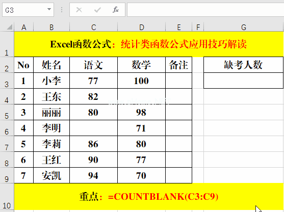 计数函数的统计对象是一个数值。在C3:C9区域,“缺考”为文本类型,因此统计结果为6。