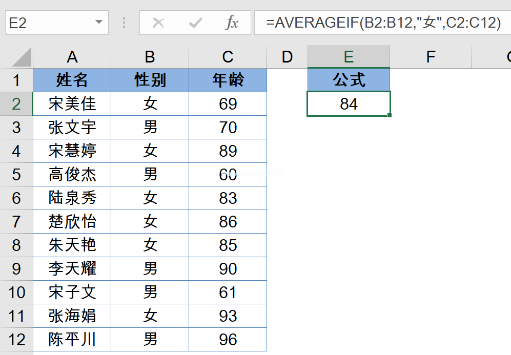 =AVERAGIEF(b 2: b 12,“女”,C2:C12)。