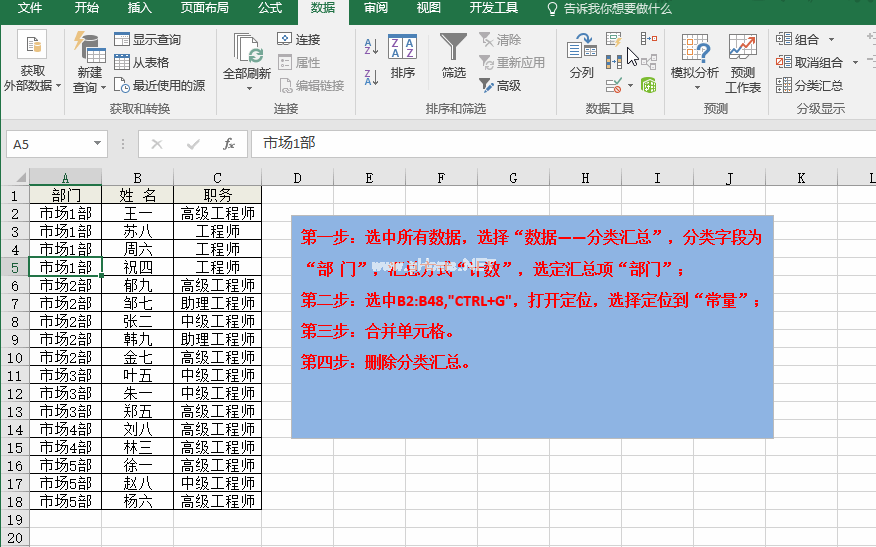 第一步:选择所有数据,选择“数据——分类汇总”,分类字段为“部门”,汇总方式为“盘点”,汇总项目为“部门”;