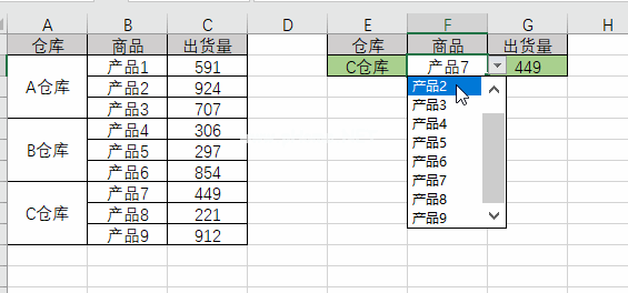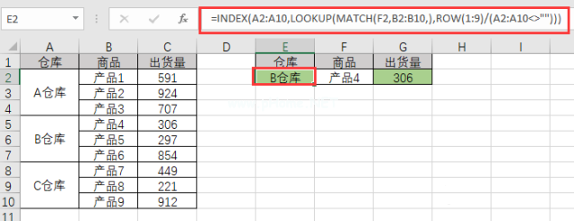 所有的“仓库”都是合并的单元。输入“仓库”和货物,就可以找到对应的出货。结果如下: