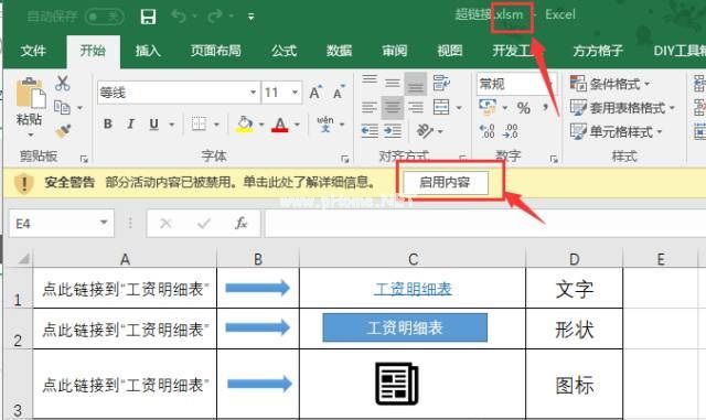 2.使用VBA命令保存工作表时,请选择“启用宏的工作簿”()的格式。xlsm”),下次打开时,选择“启用内容”: